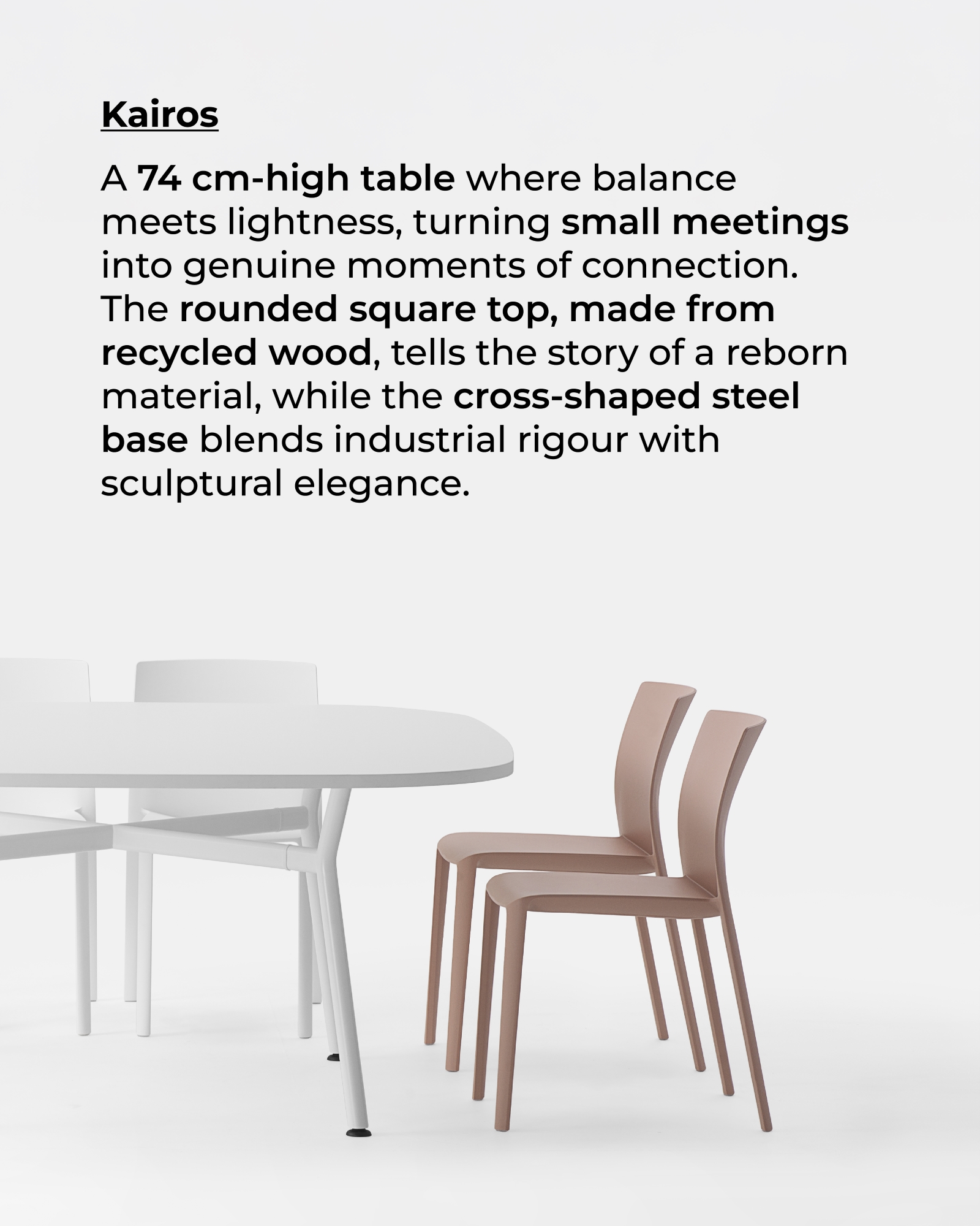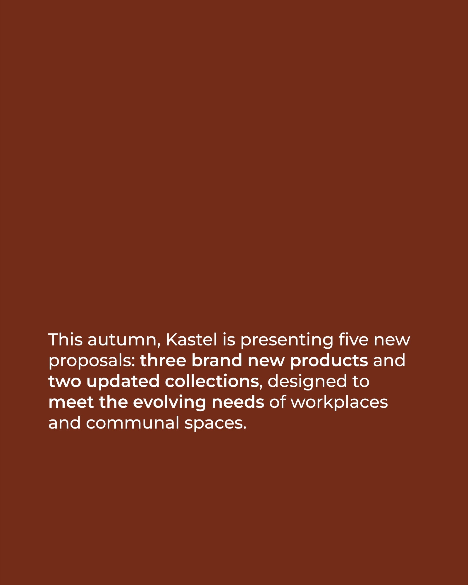 Kastel introduce cinque nuove proposte: tre prodotti inediti e due collezioni aggiornate, progettate per soddisfare le nuove esigenze degli ambienti di lavoro e collettivi.