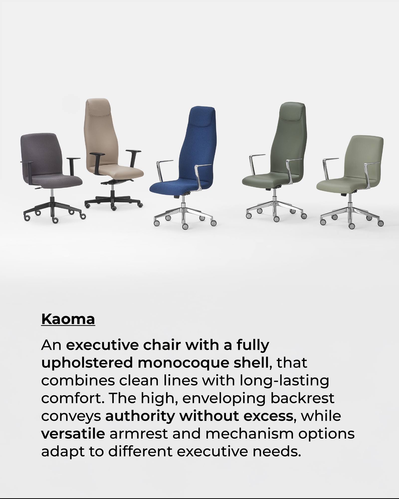 KAOMA: Poltrona direzionale con monoscocca interamente imbottita. Versioni con schienale alto con appoggiatesta e schienale medio. Varie soluzioni di braccioli e meccanismi.