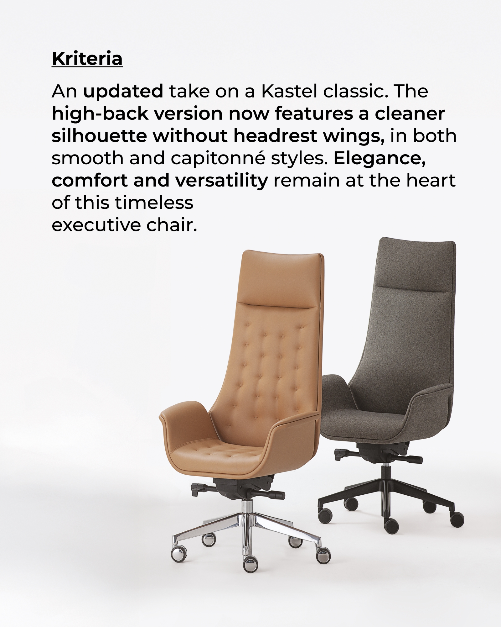 KRITERIA: Nuove versioni presidenziali, liscie e capitonnè, con schienale alto senza alette sul poggiatesta.