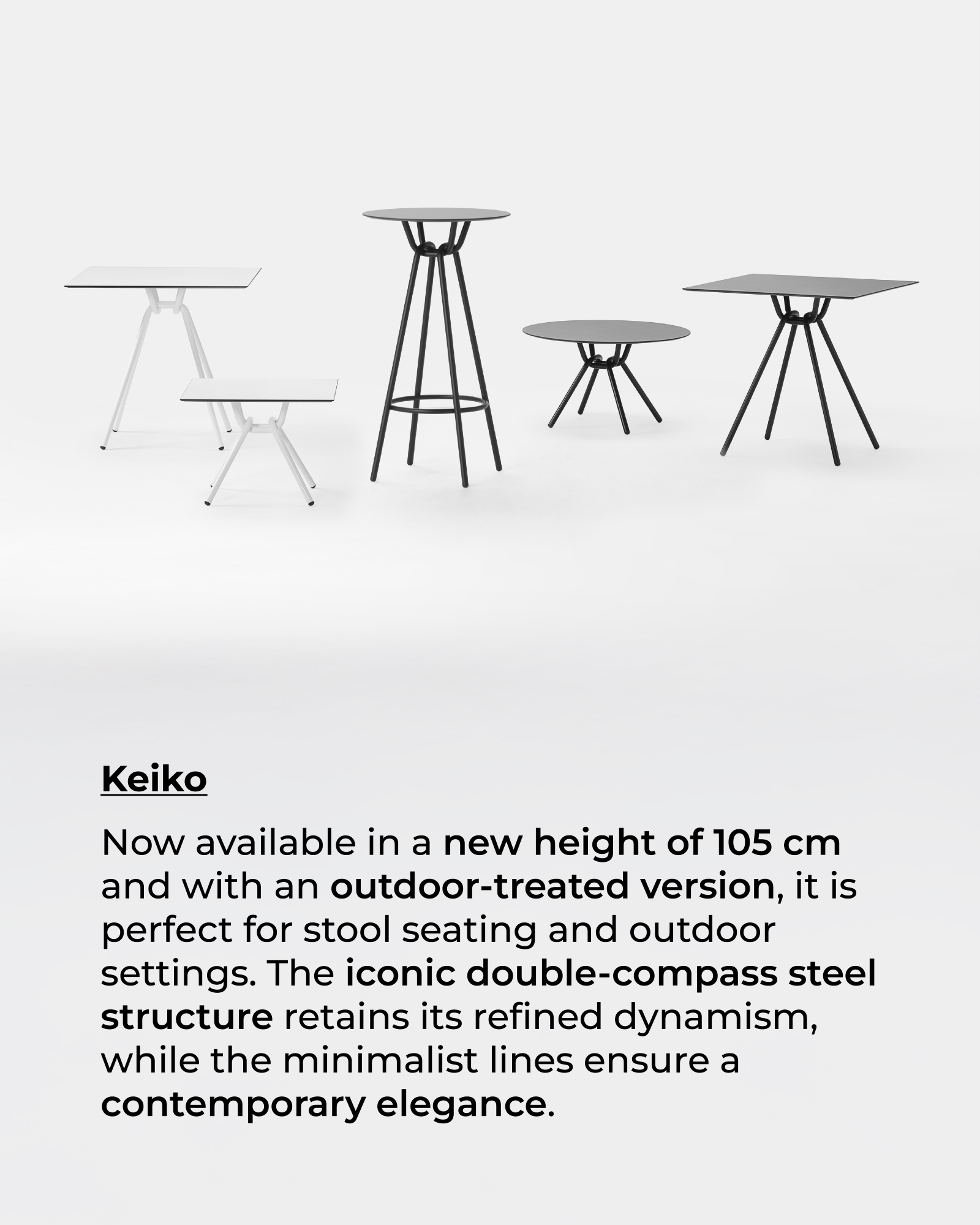 KEIKO: Versioni con trattamento “outdoor” per utilizzo in esterni e nuova base in acciaio verniciato h. 105.