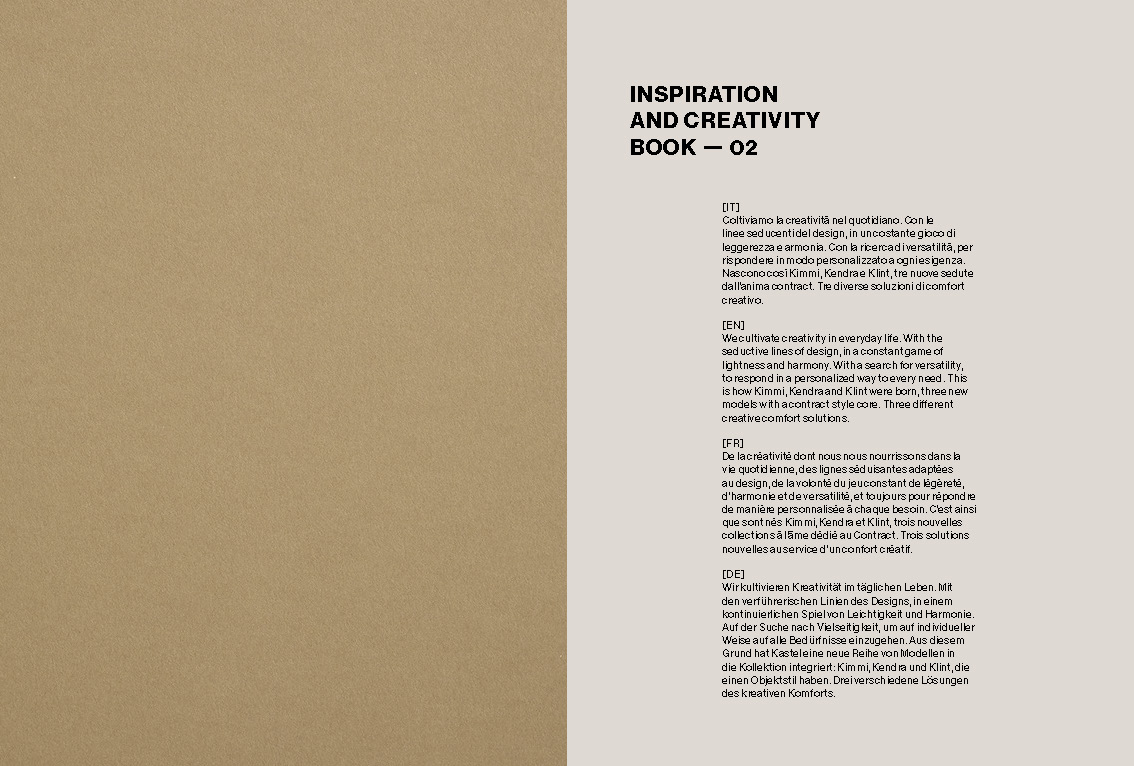 Coltiviamo la creatività nel quotidiano. Con le linee seducenti del design, in un costante gioco di leggerezza e armonia. Con la ricerca di versatilità, per rispondere in modo personalizzato a ogni esigenza. Nascono così Kimmi, Kendra e Klint, tre nuove sedute dall’anima contract. Tre diverse soluzioni di comfort creativo.