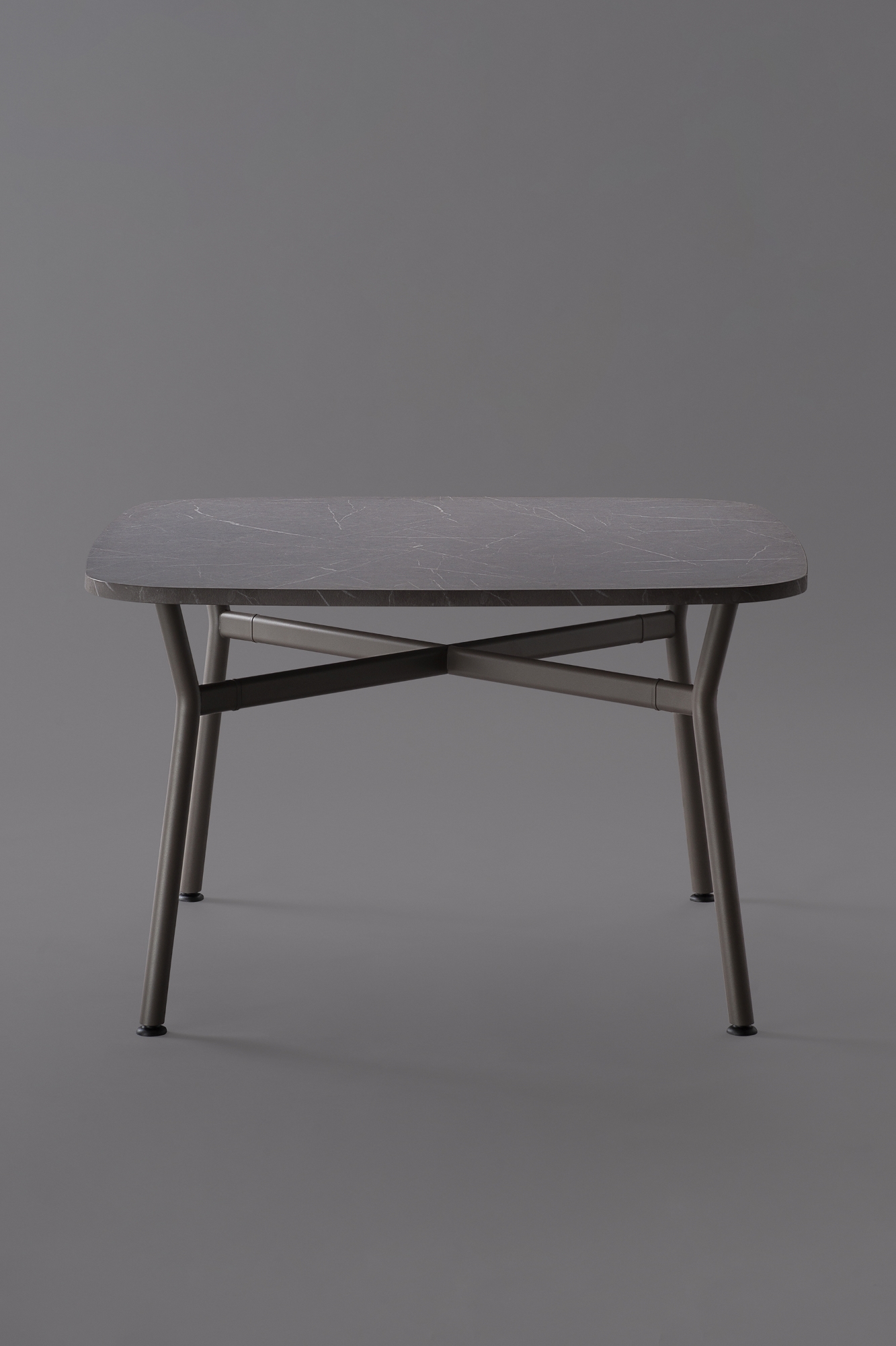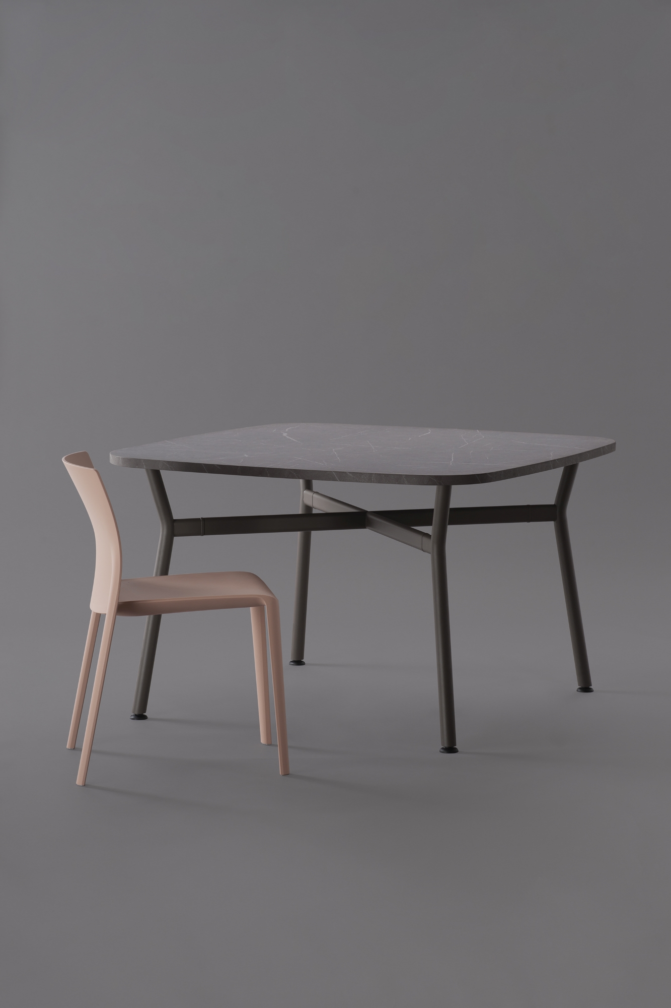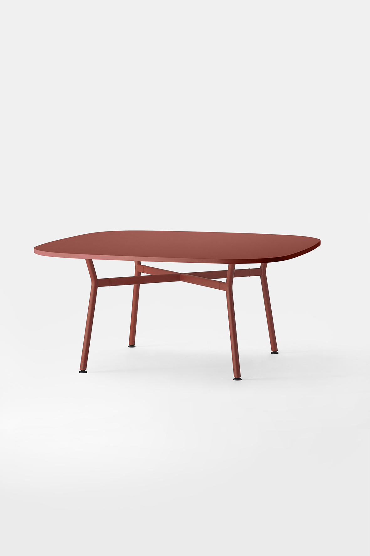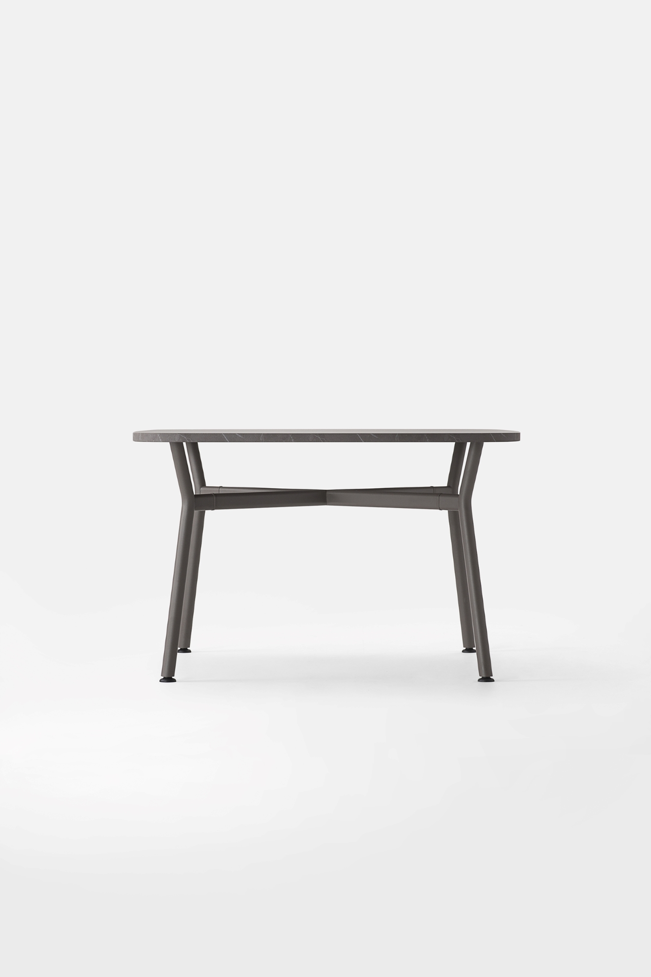 Il piano, realizzato in legno rigenerato a basso impatto ambientale, laminato e rifinito da un bordo accurato, ci racconta la storia di una materia che rinasce: ogni fibra custodisce il valore della sostenibilità e invita al contatto, alla scoperta, al dialogo. La struttura a crociera disegna un’architettura essenziale e scultorea. I montanti in tubo tondo, solidi, generosi, si incontrano con elementi orizzontali di raccordo dalla linea ovale, creando un sostegno invisibilmente potente, perfettamente bilanciato tra rigore industriale e delicatezza formale.