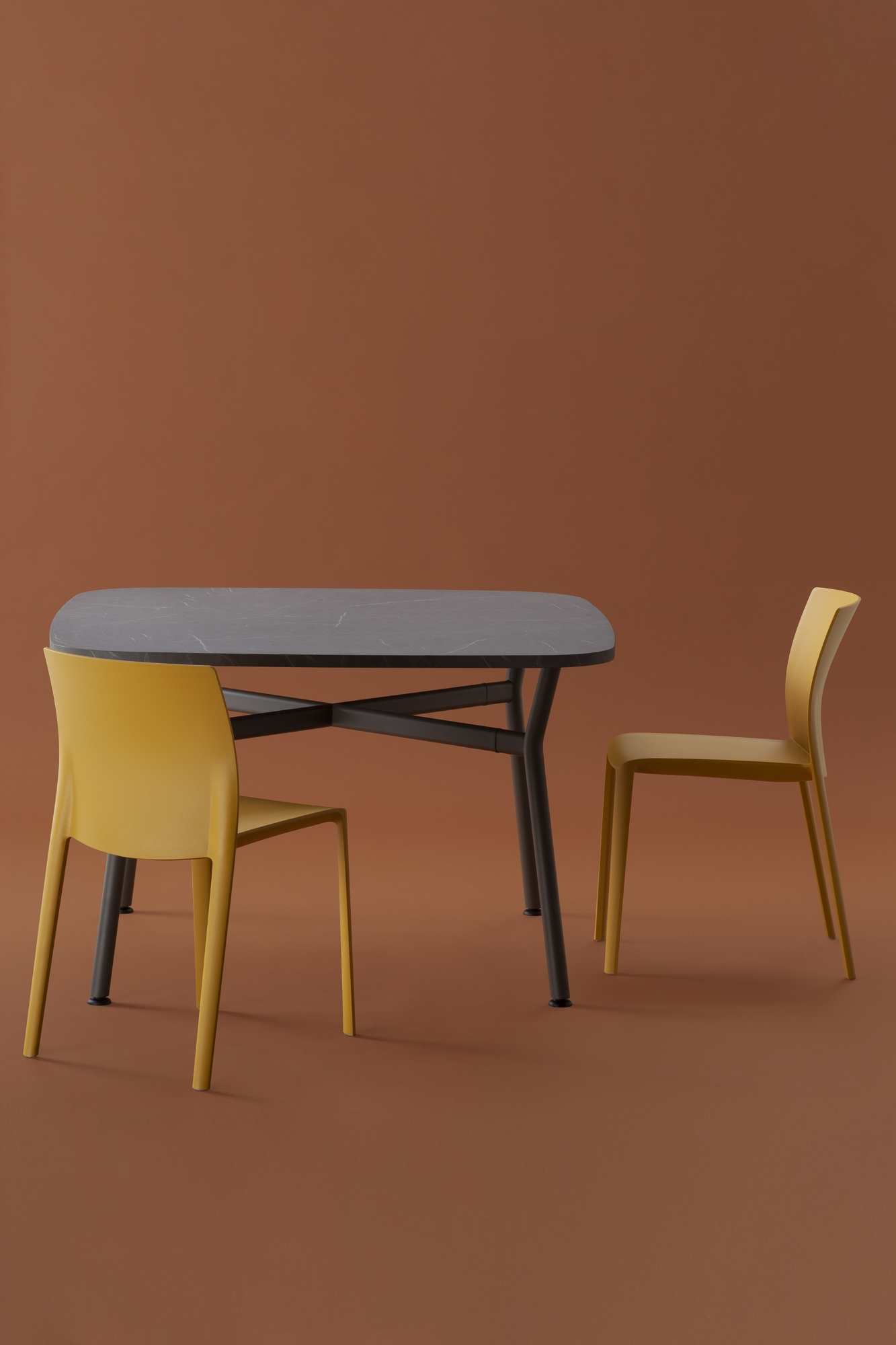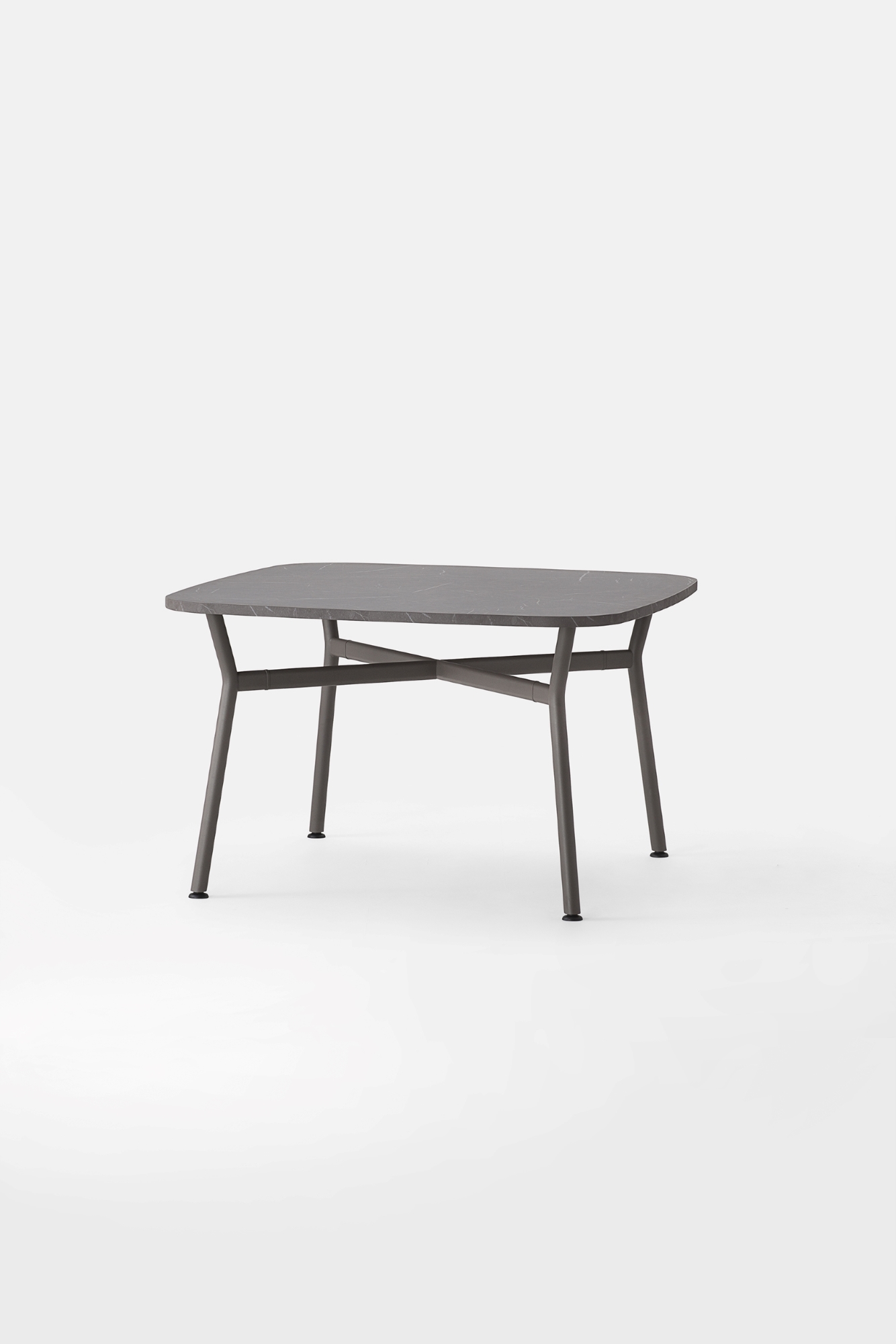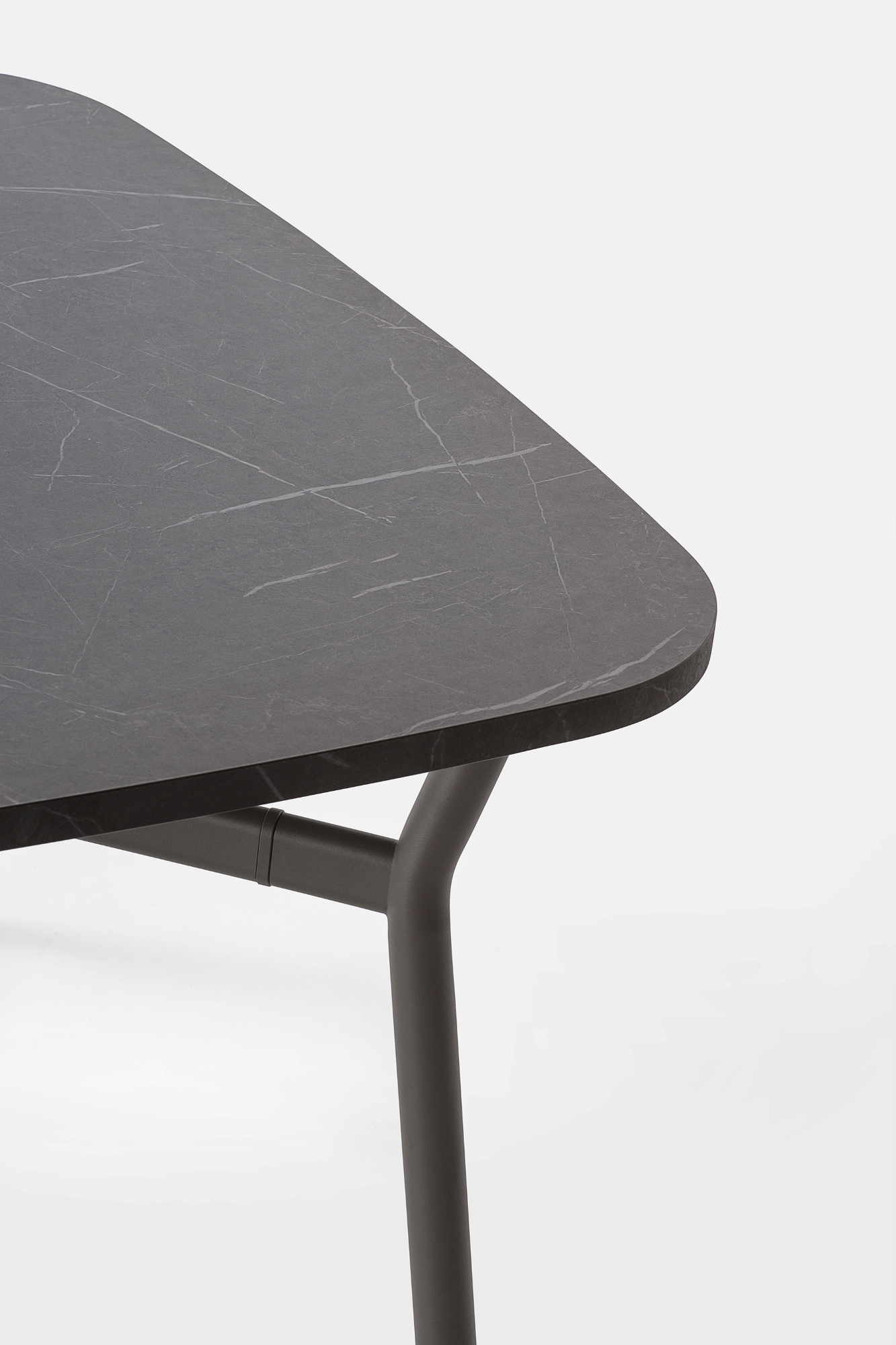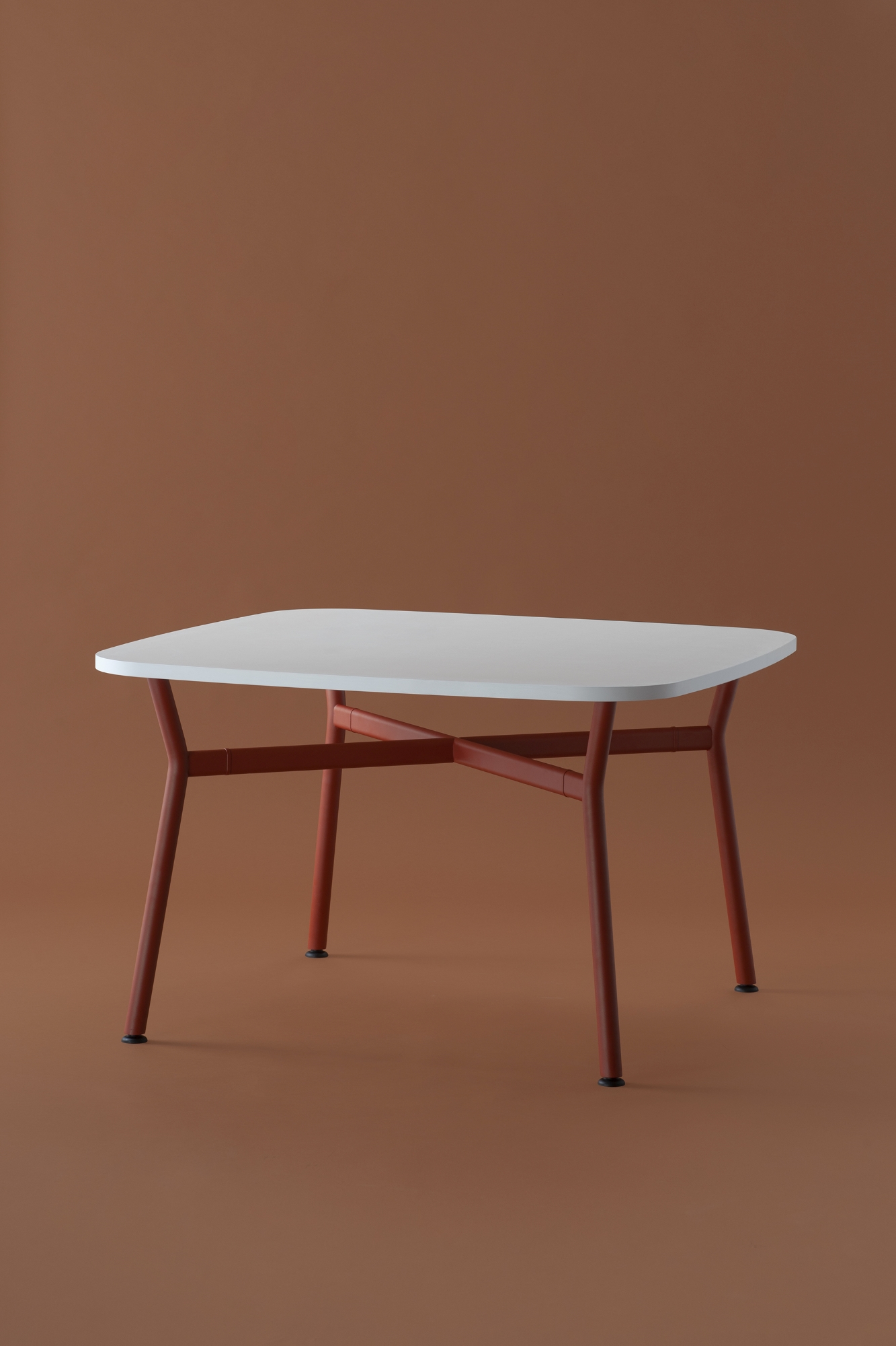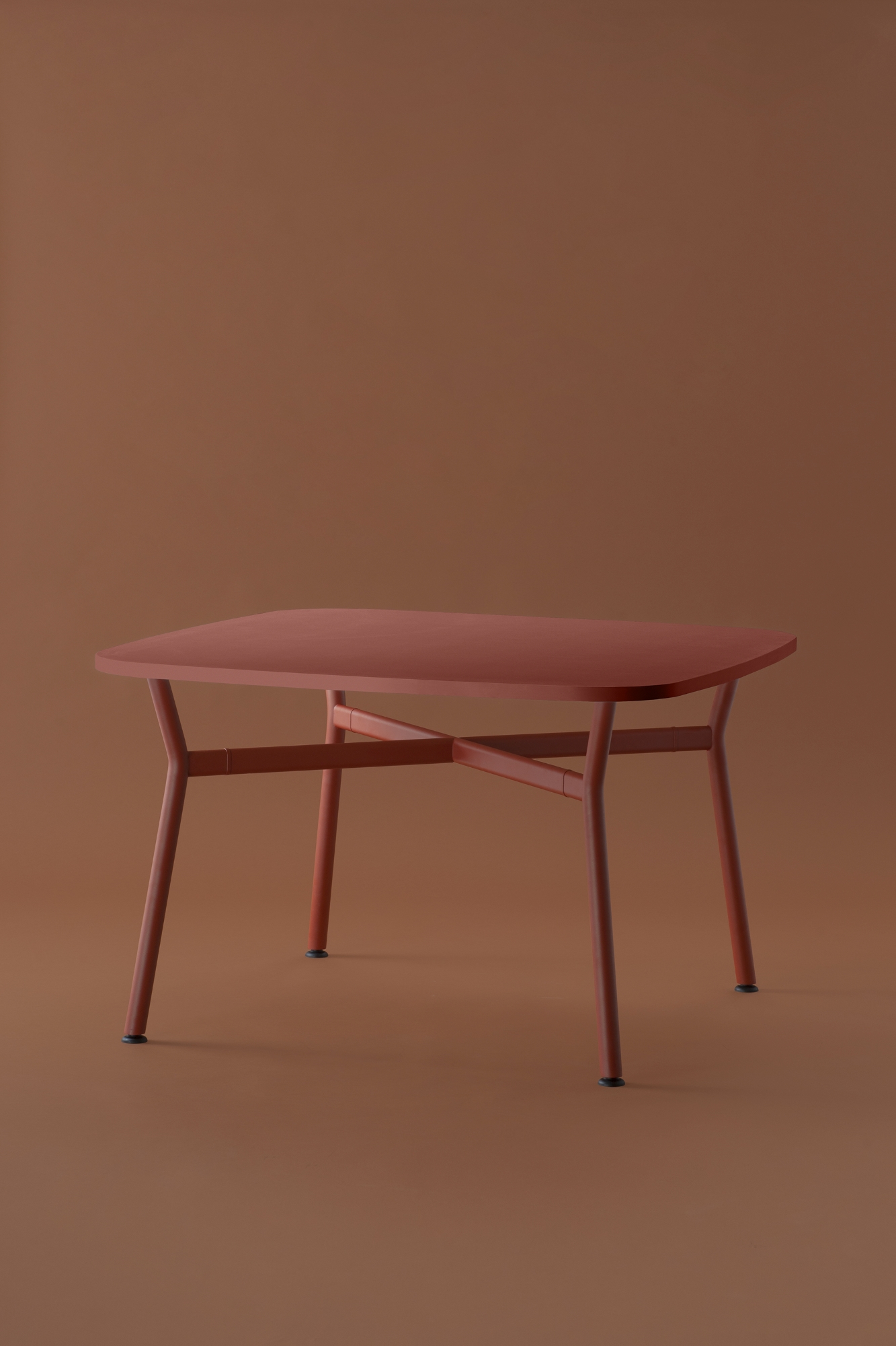 Il piano, realizzato in legno rigenerato a basso impatto ambientale, laminato e rifinito da un bordo accurato, ci racconta la storia di una materia che rinasce: ogni fibra custodisce il valore della sostenibilità e invita al contatto, alla scoperta, al dialogo. La struttura a crociera disegna un’architettura essenziale e scultorea. I montanti in tubo tondo, solidi, generosi, si incontrano con elementi orizzontali di raccordo dalla linea ovale, creando un sostegno invisibilmente potente, perfettamente bilanciato tra rigore industriale e delicatezza formale.