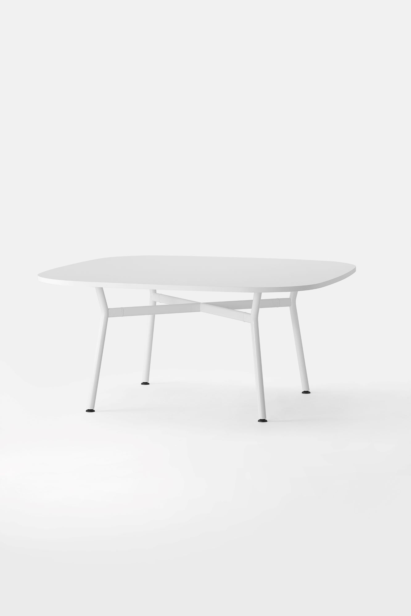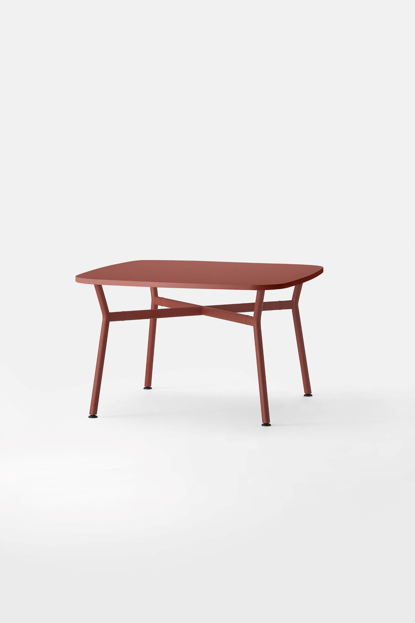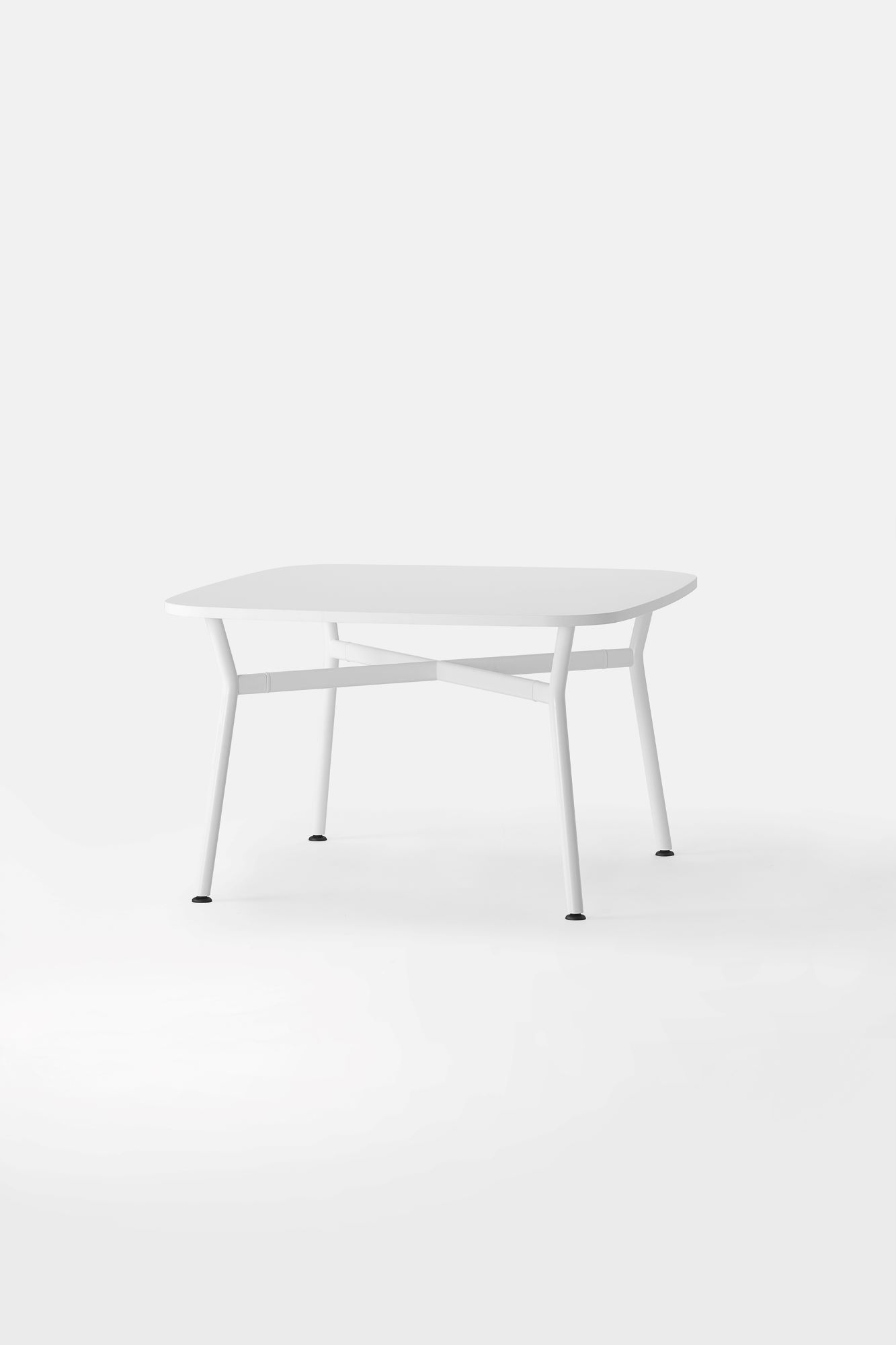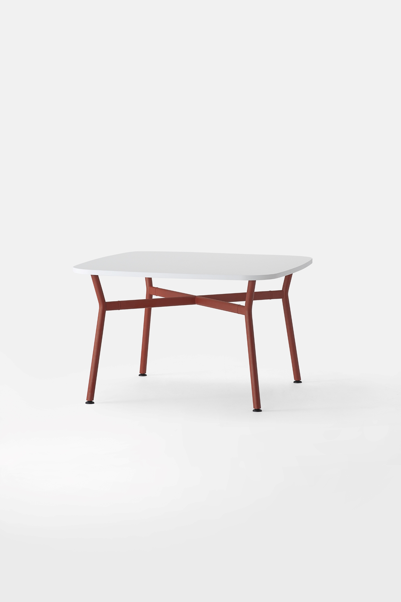 Il piano, realizzato in legno rigenerato a basso impatto ambientale, laminato e rifinito da un bordo accurato, ci racconta la storia di una materia che rinasce: ogni fibra custodisce il valore della sostenibilità e invita al contatto, alla scoperta, al dialogo. La struttura a crociera disegna un’architettura essenziale e scultorea. I montanti in tubo tondo, solidi, generosi, si incontrano con elementi orizzontali di raccordo dalla linea ovale, creando un sostegno invisibilmente potente, perfettamente bilanciato tra rigore industriale e delicatezza formale.