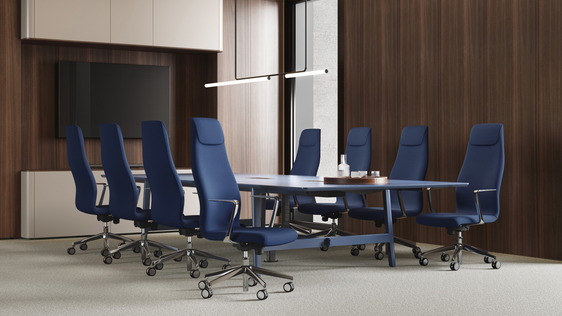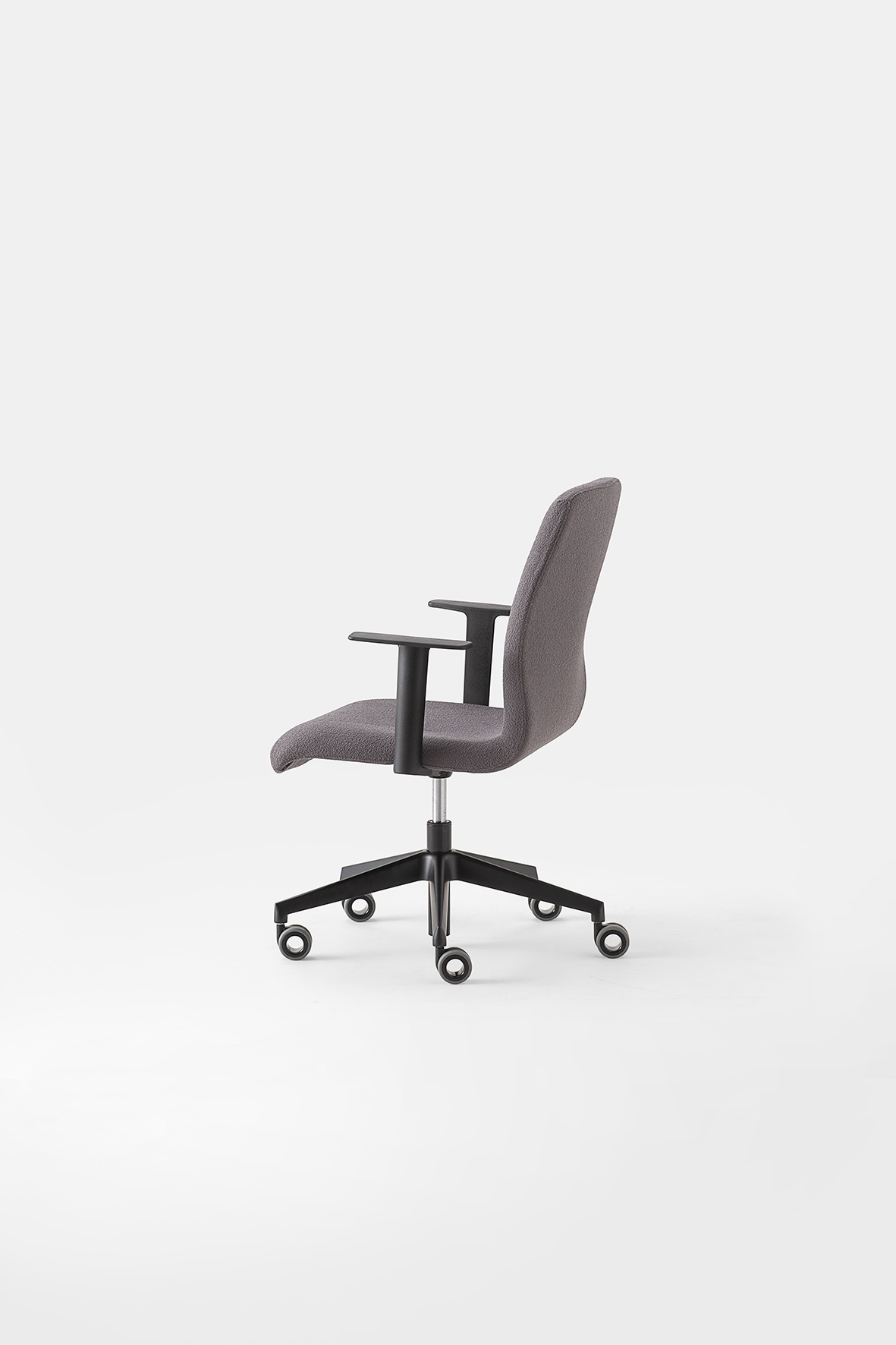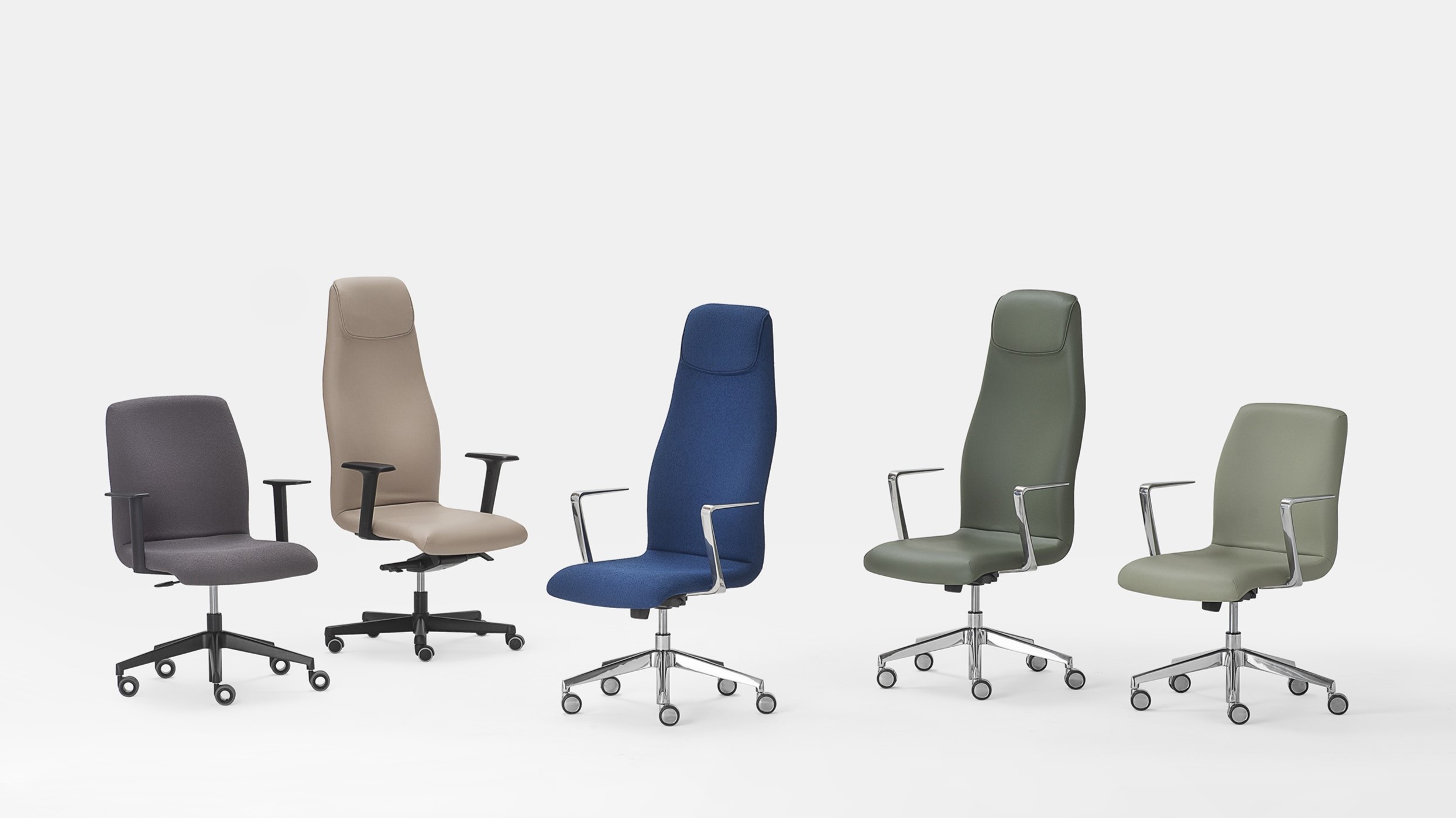 Proposta con diverse soluzioni di meccanismi e di braccioli, rivestita con tessuti materici e vibranti, accarezza lo sguardo e offre un comfort discreto, ideale per lunghe ore di lavoro creativo o decisioni strategiche.