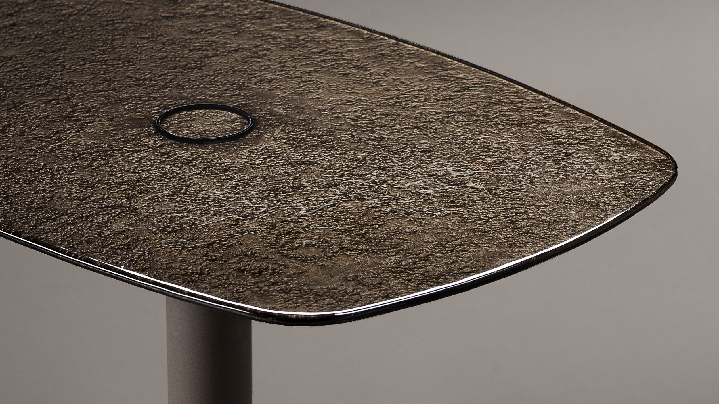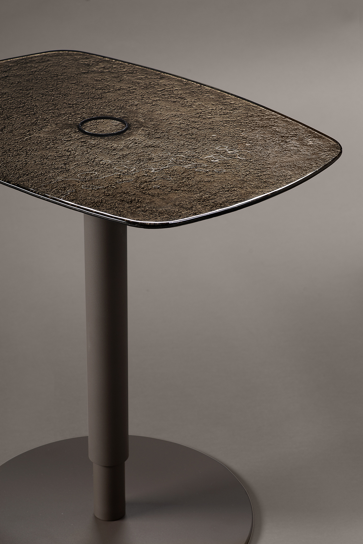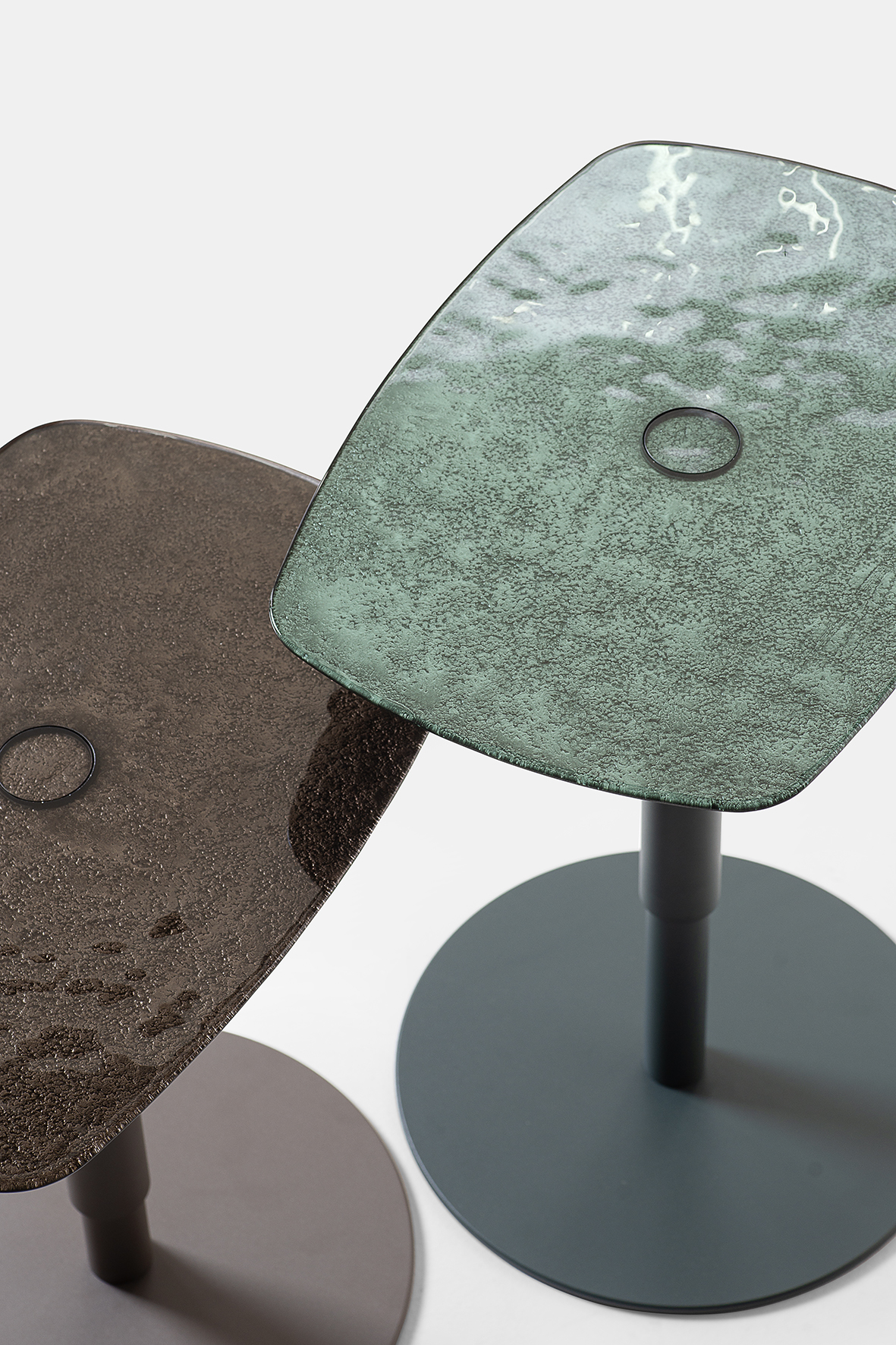 Il sapore della percezione del vetro termoformato di ispirazione veneziana, si fonde con i connotati tecnici del tavolino.