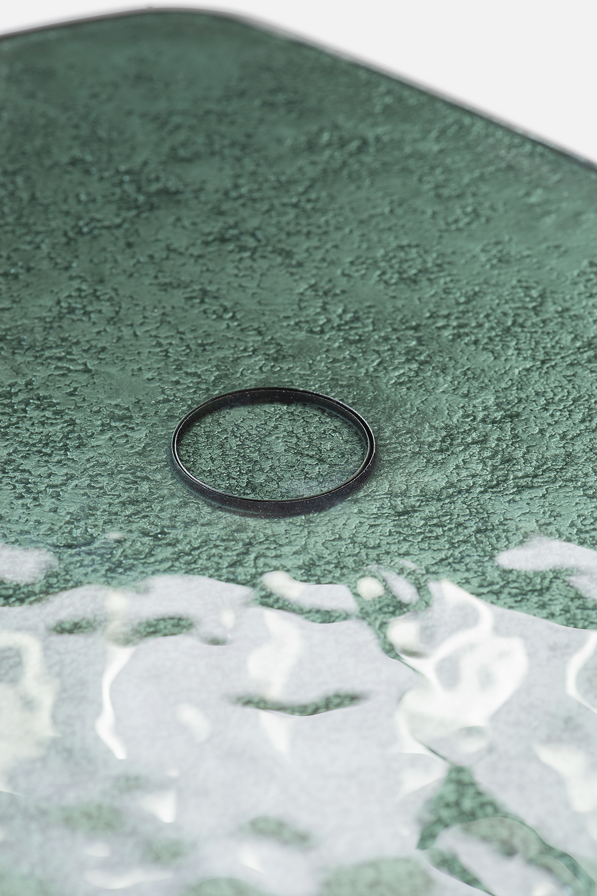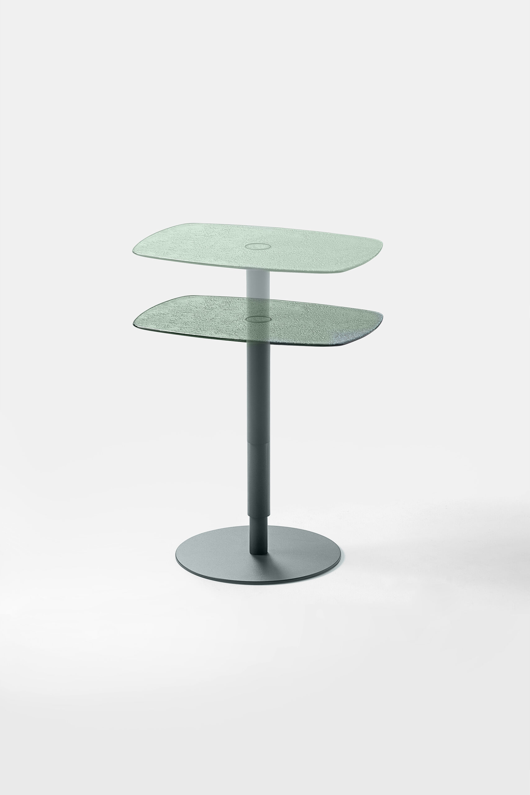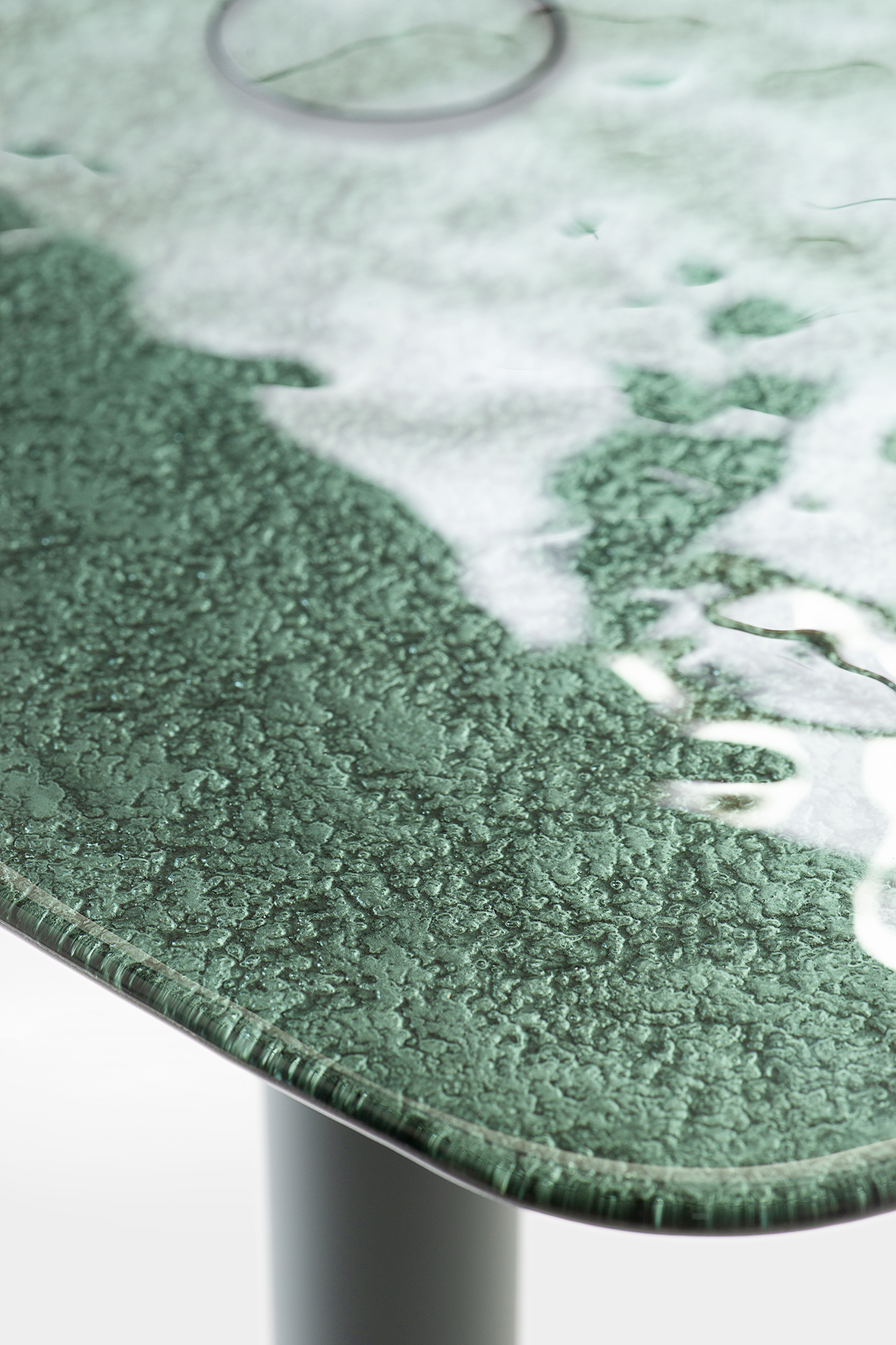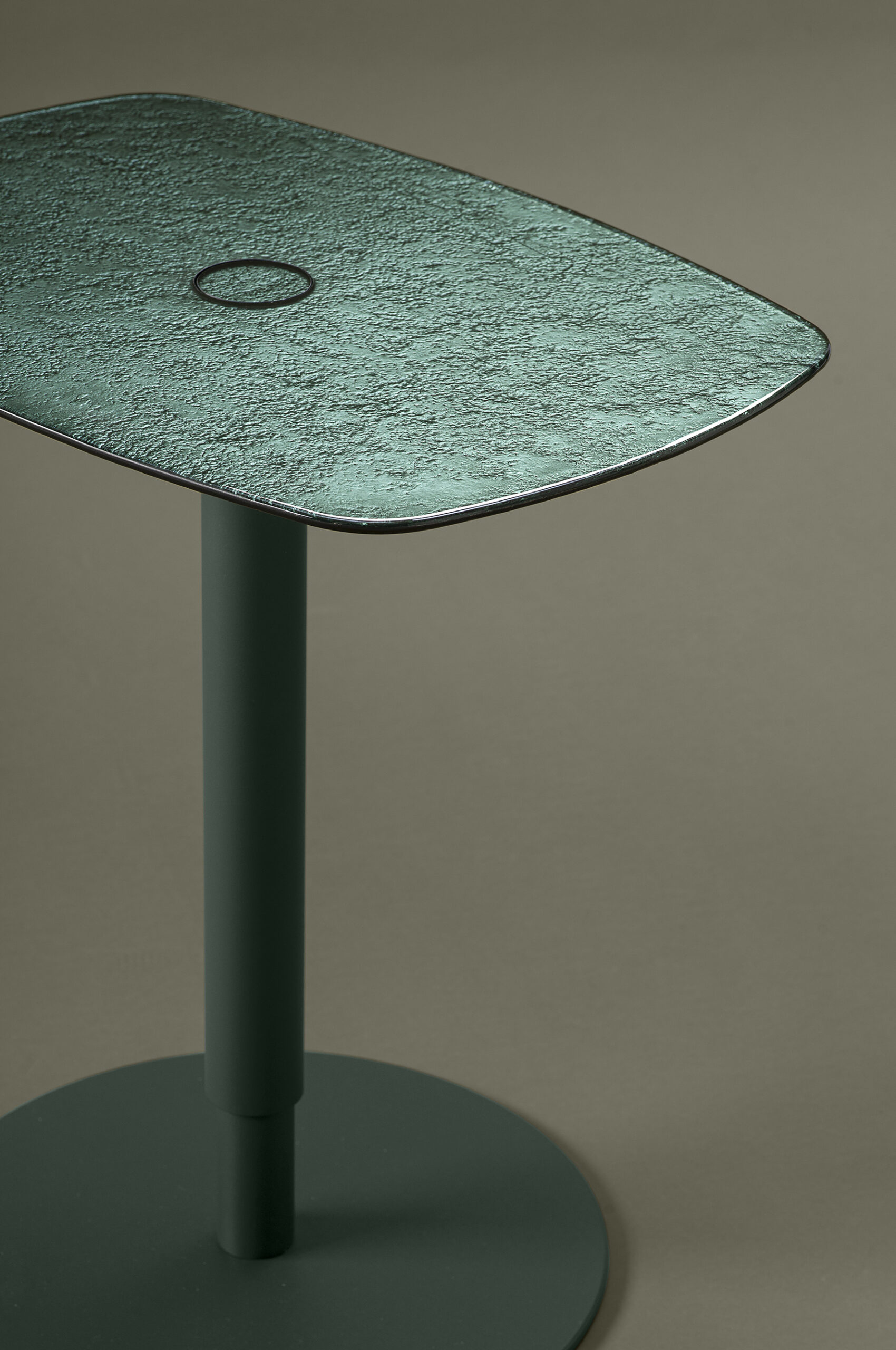 Il sapore della percezione del vetro termoformato di ispirazione veneziana, si fonde con i connotati tecnici del tavolino.