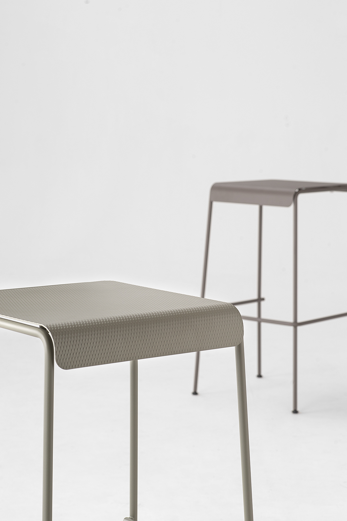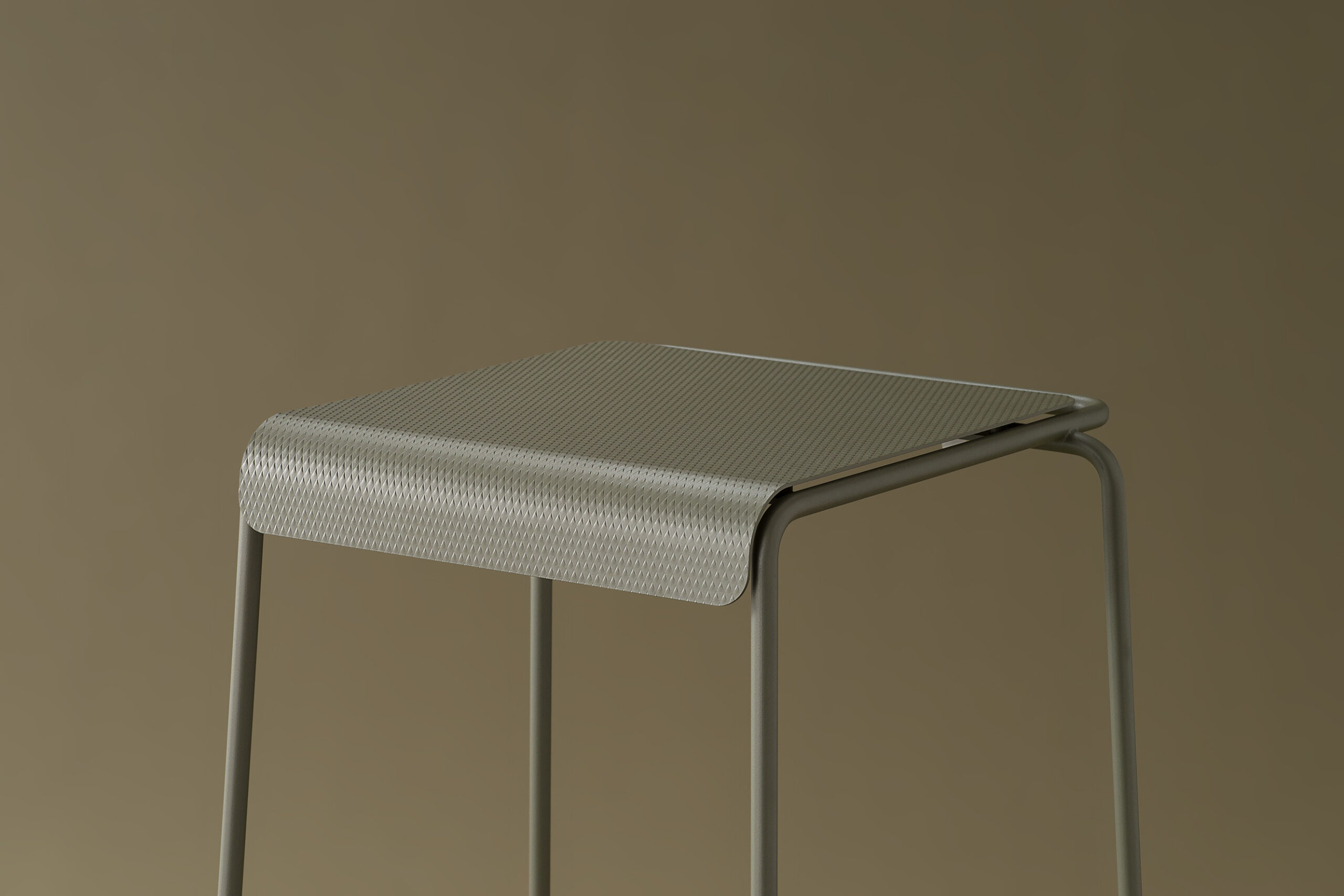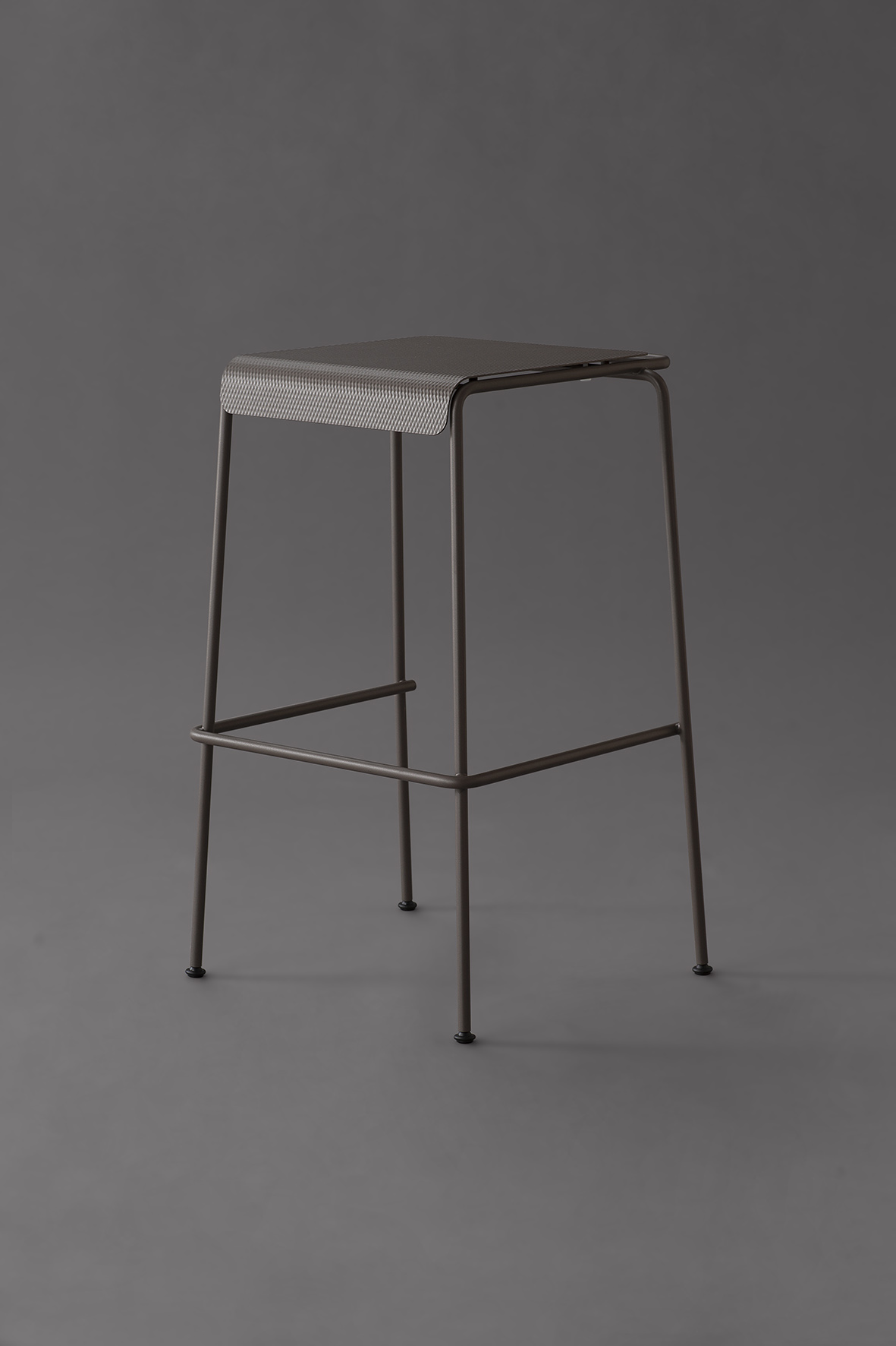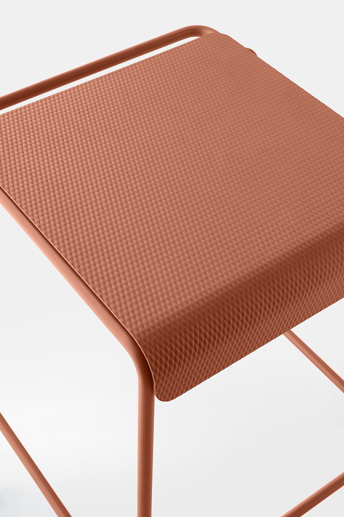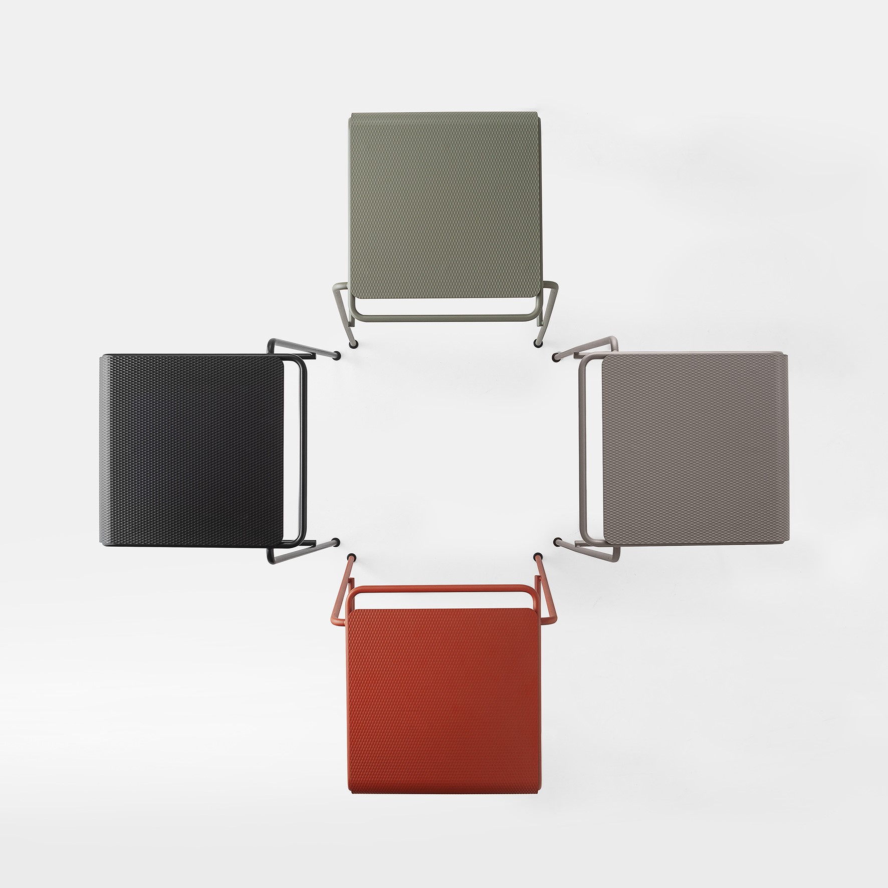 La seduta, realizzata in lamiera di acciaio inox testurizzato e verniciato, sorprende per la finitura che evoca un tessuto: un invito tattile e visivo a sedersi, toccare, scoprire.