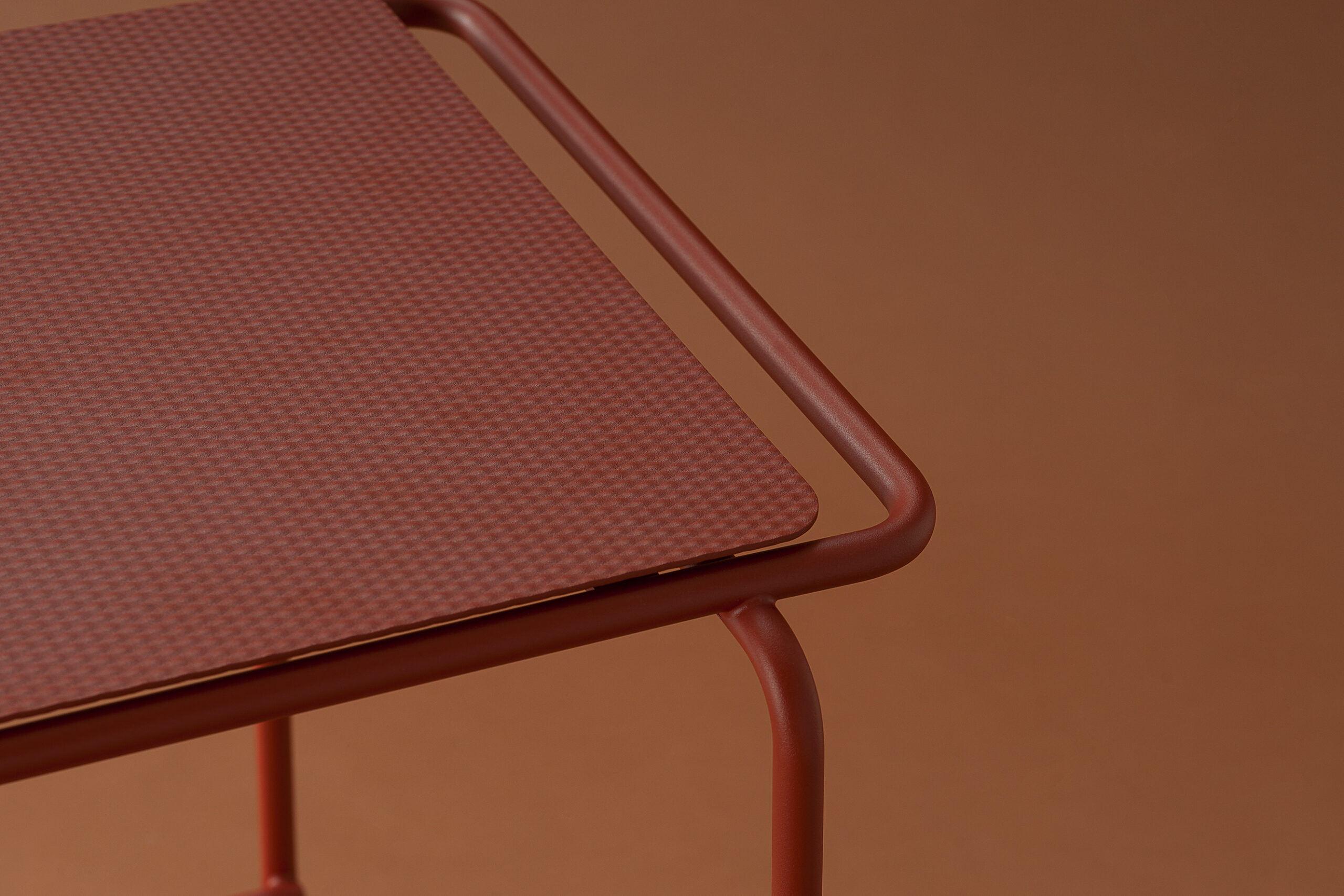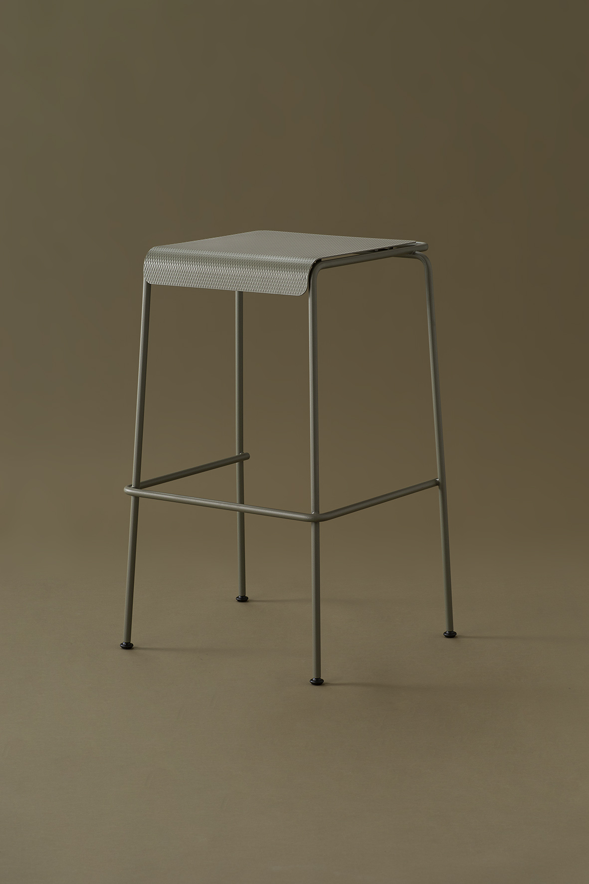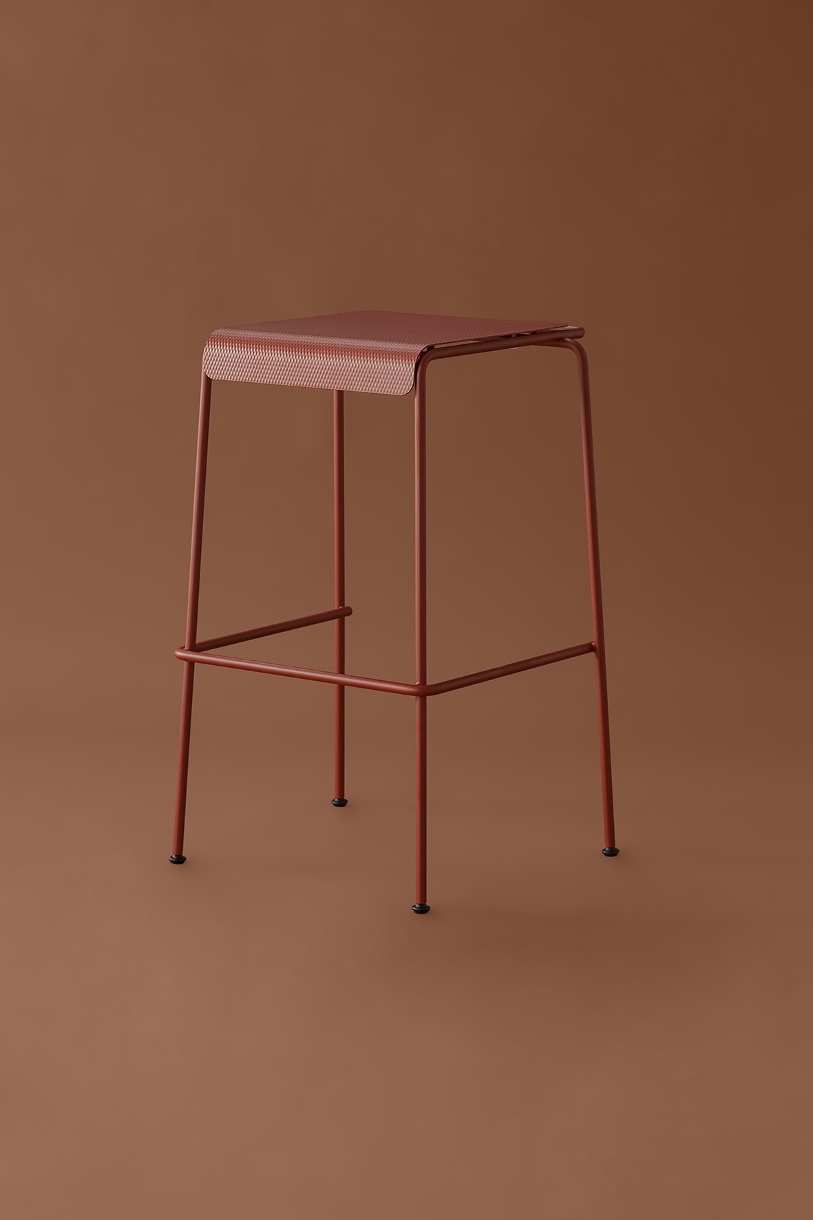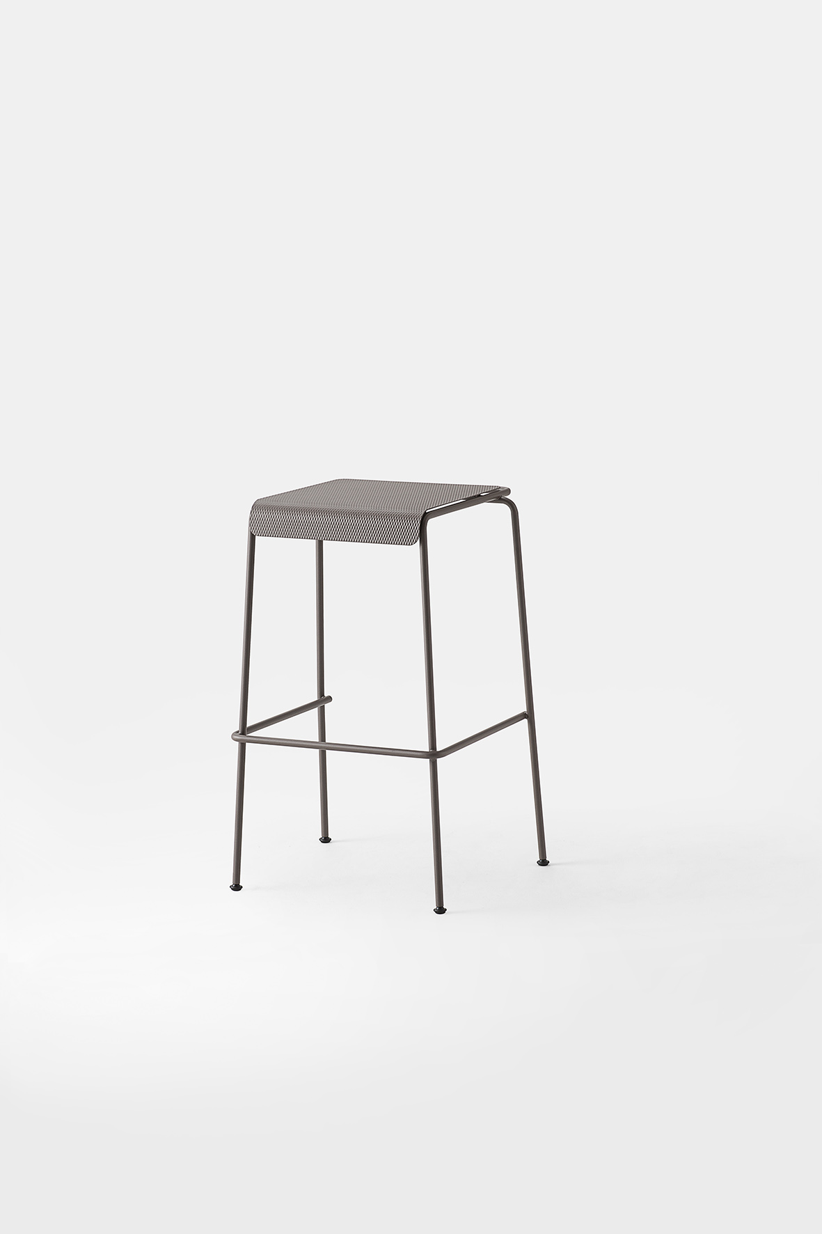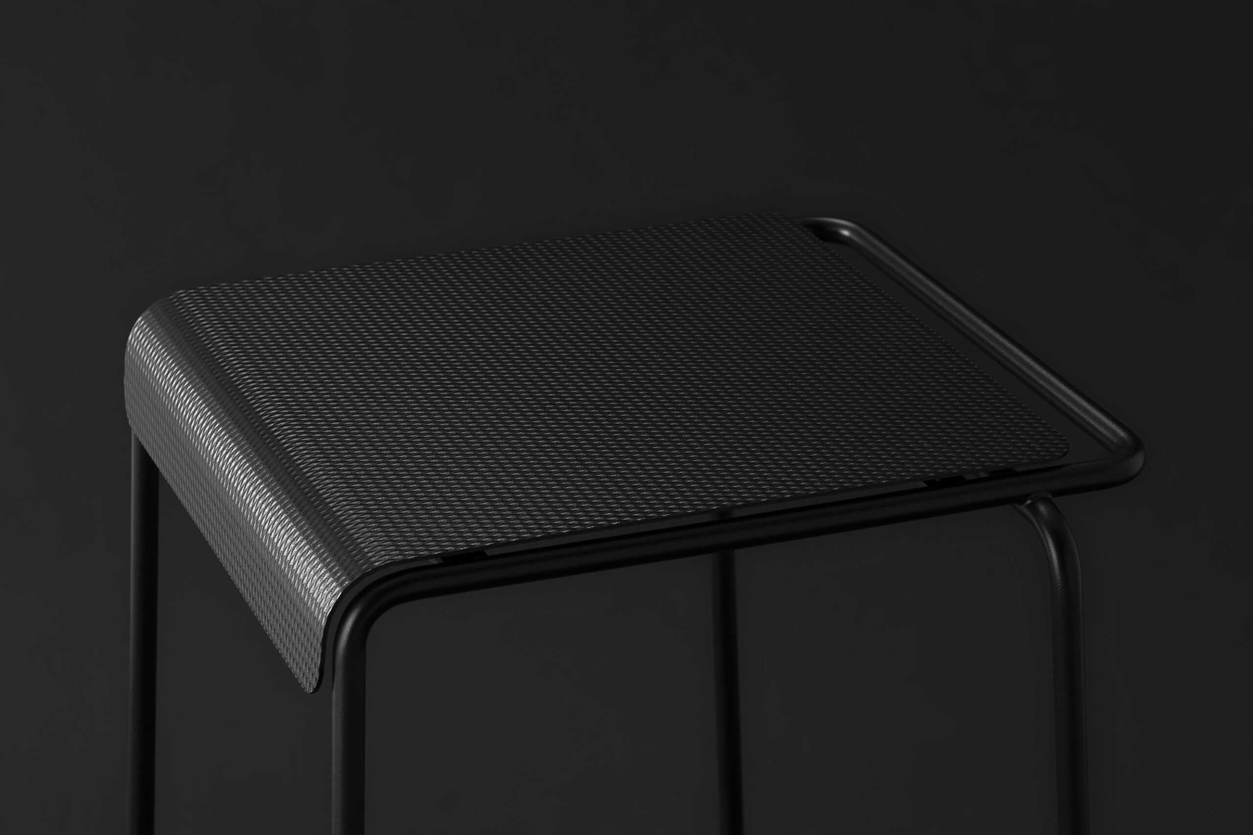 La seduta, realizzata in lamiera di acciaio inox testurizzato e verniciato, sorprende per la finitura che evoca un tessuto: un invito tattile e visivo a sedersi, toccare, scoprire.